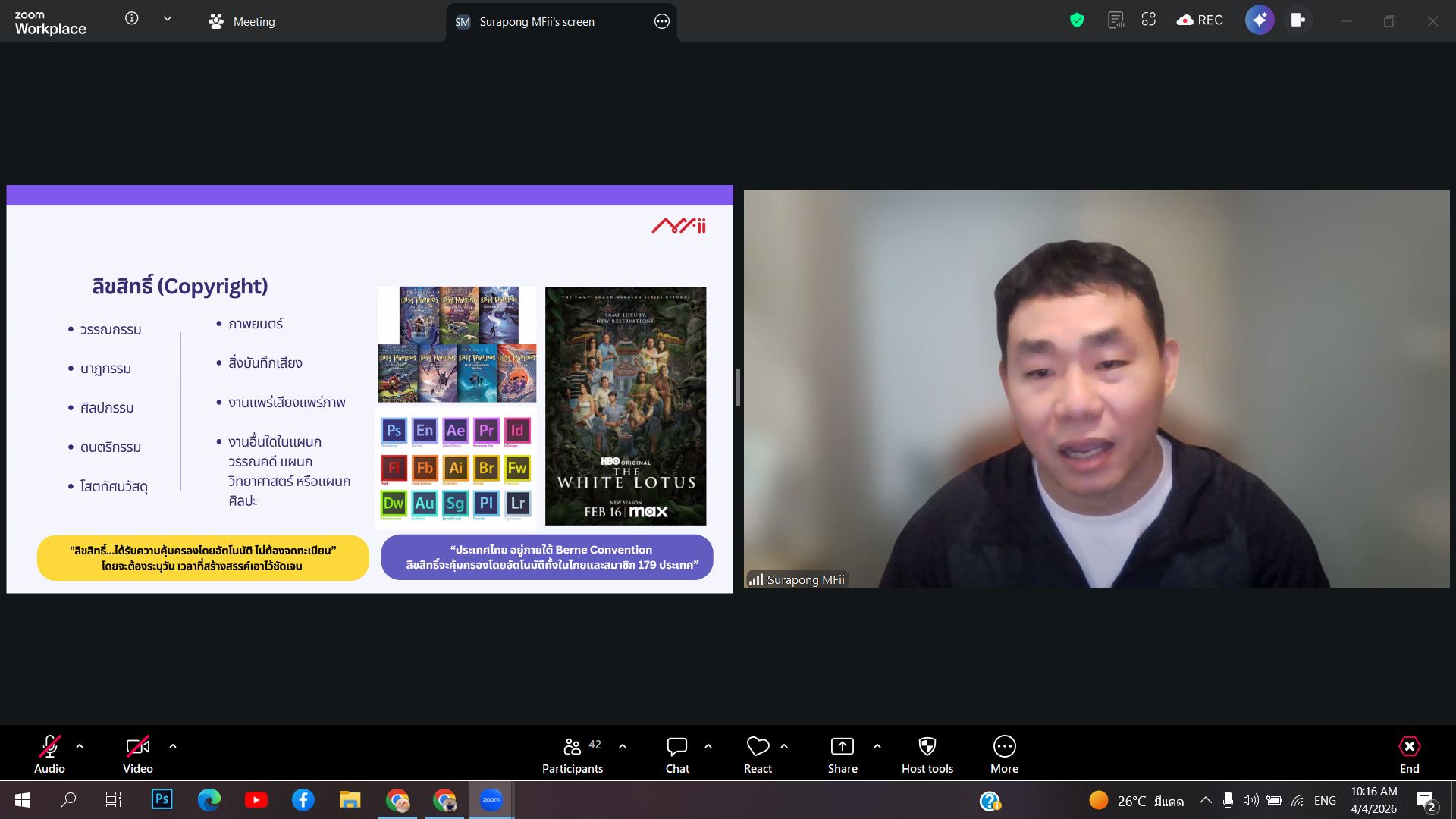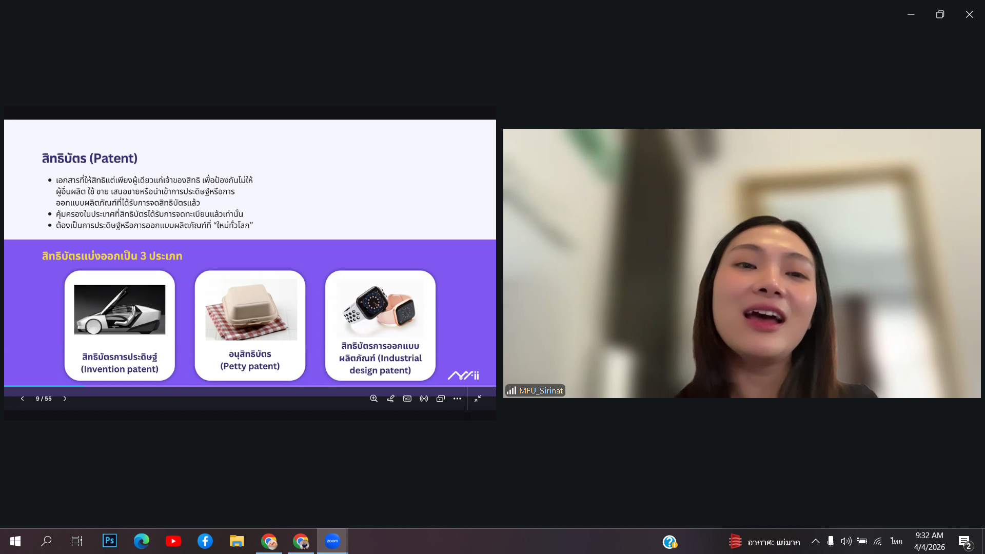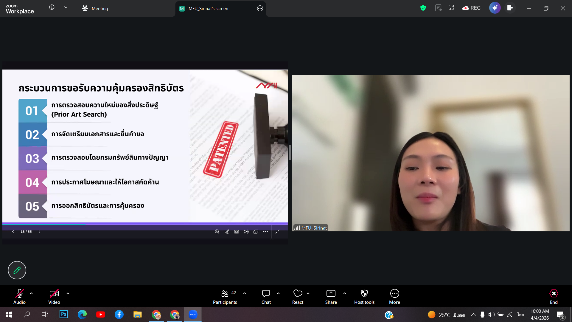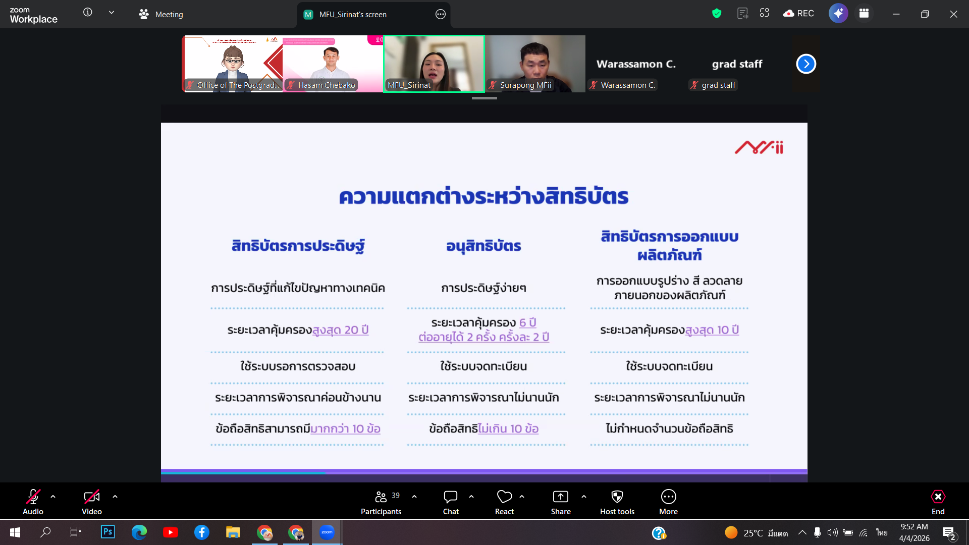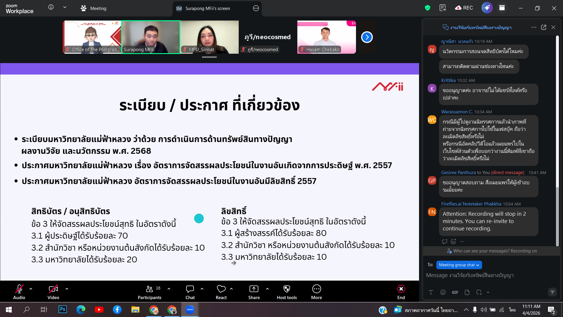 สำนักงานบัณฑิตศึกษาได้จัดกิจกรรมอบรมหัวข้อ อบรมงานวิจัยกับทรัพย์สินทางปัญญา เมื่อวันเสาร์ที่ 4 เมษายน 2569 เวลา 09.00-12.00 น. ผ่านระบบออนไลน์ด้วยโปรแกรม Zoom Meeting โดยได้รับเกียรติจาก คุณสิรินาฎ เทียนทอง และคุณสุรพงษ์ เวทพิสัย จากฝ่ายจัดการทรัพย์สินทางปัญญา (IPM) ส่วนจัดการทรัพย์สินทางปัญญาและนวัตกรรม ม.แม่ฟ้าหลวง เป็นวิทยากรในการบรรยาย