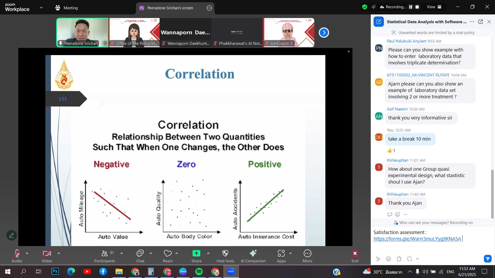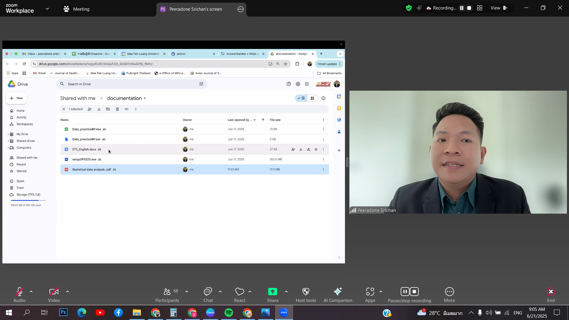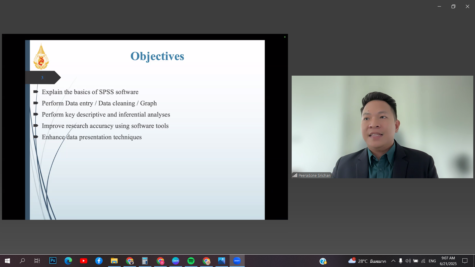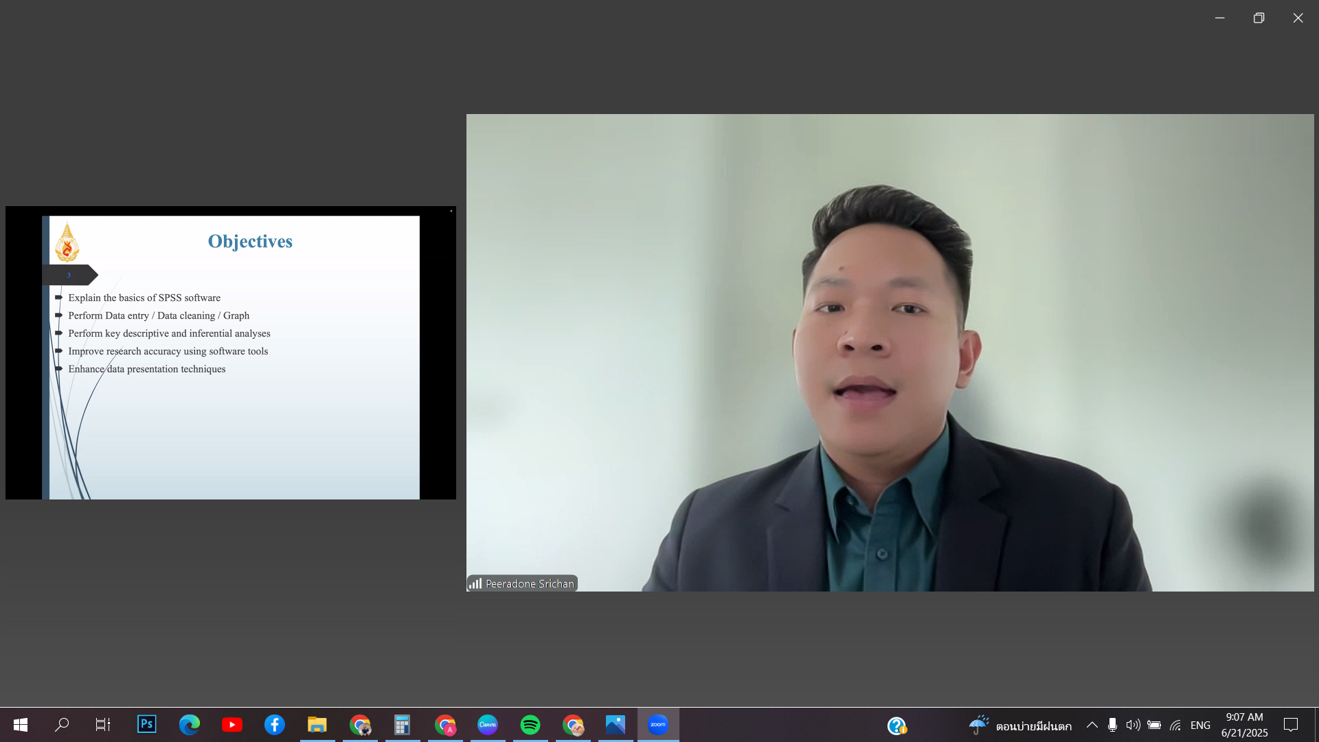 The Office of the Postgraduate Studies organized a training workshop titled “Statistical Data Analysis with Software Tools (SPSS)” on Saturday, June 21, 2025, via Zoom Meeting. The session featured Asst. Prof. Dr. Peeradone Srichan from the School of Health Science, Mae Fah Luang University, as the speaker.
