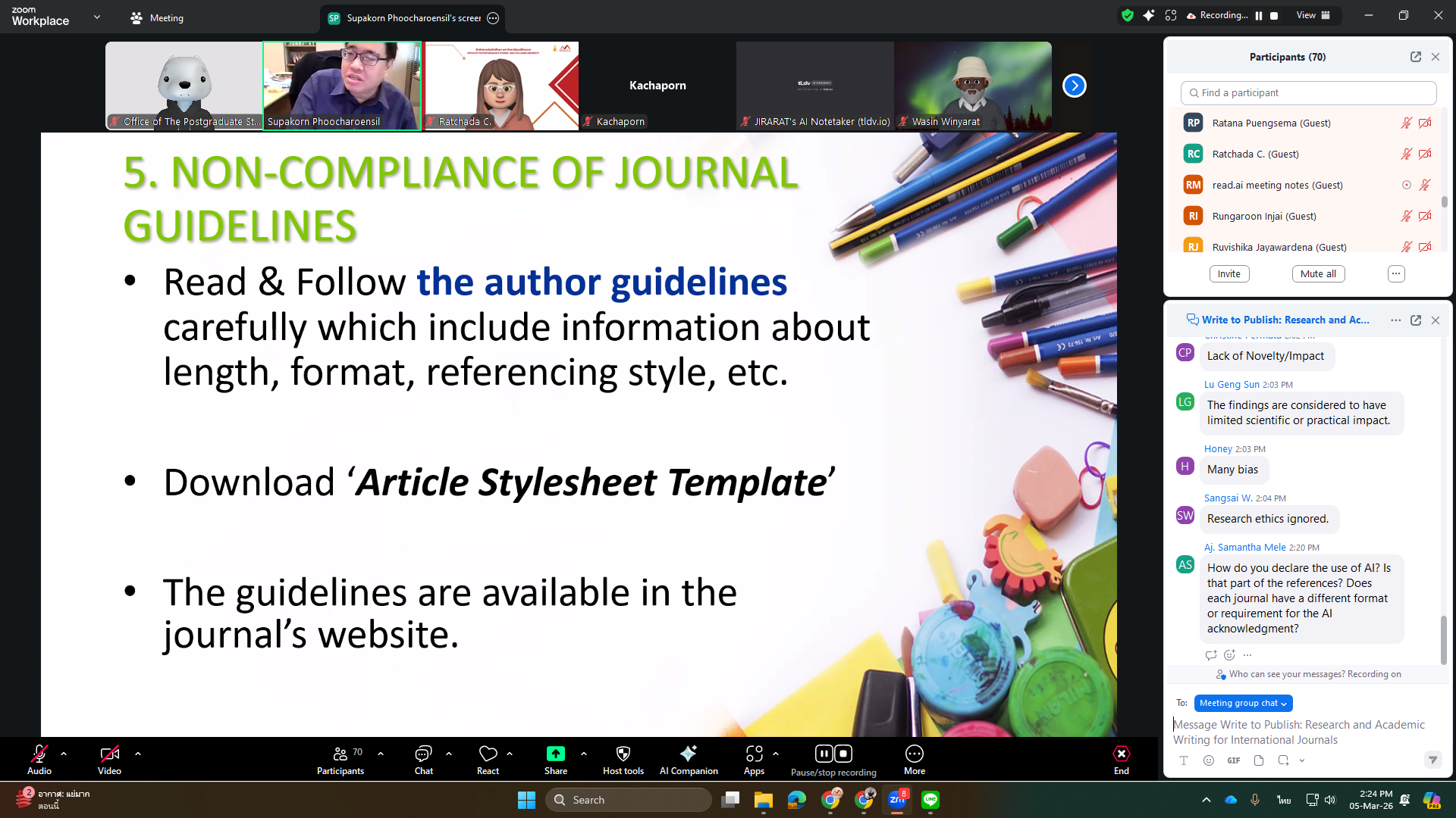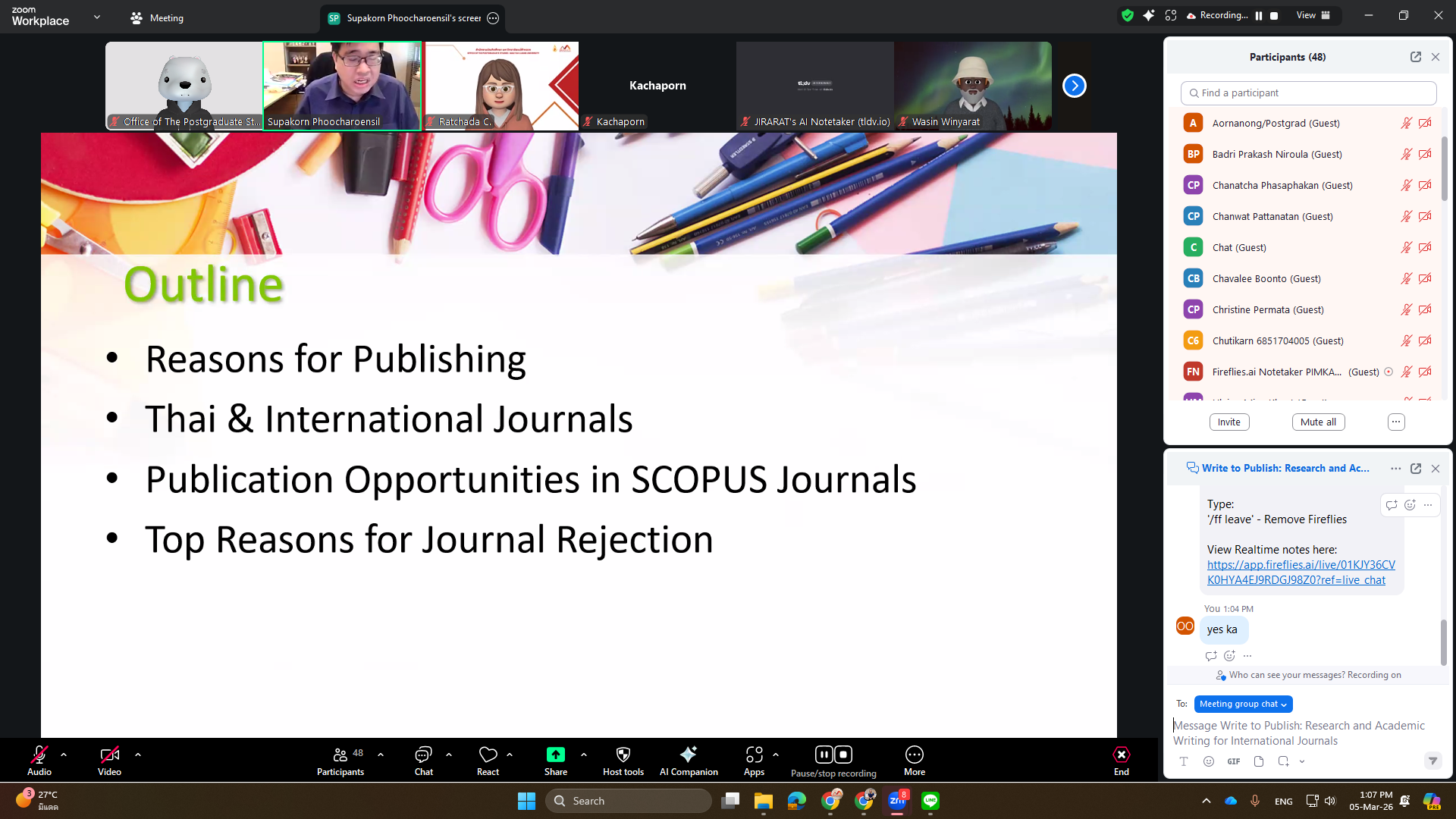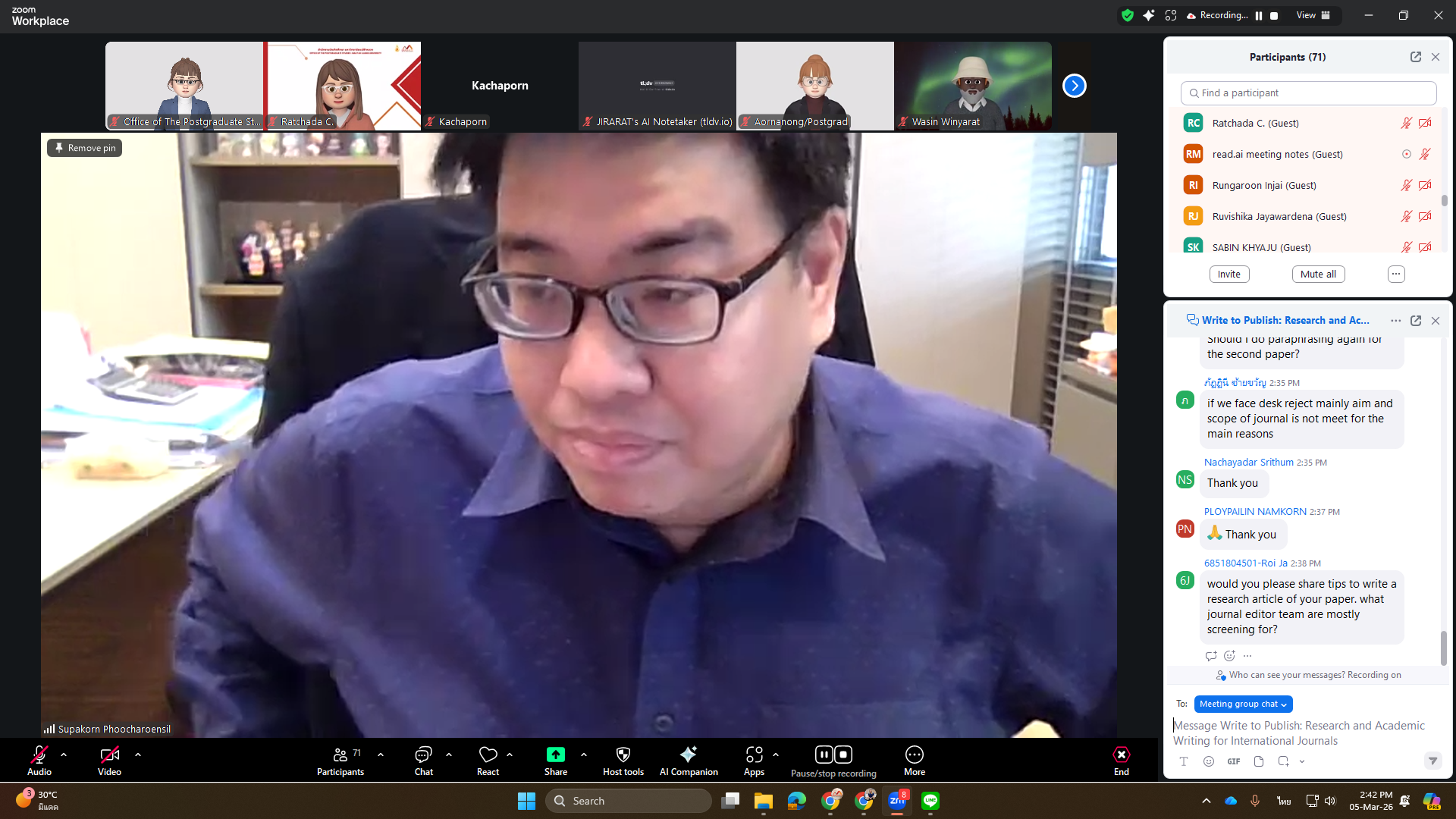 The Office of the Postgraduate Studies organized a training workshop titled “Write to Publish: Research and Academic Writing for International Journals” on Thursday, March 5, 2026, via Zoom Meeting. The session featured Assoc. Prof. Dr. Supakorn Phoocharoensil, Director of the Language Institute at Thammasat University, as the speaker.