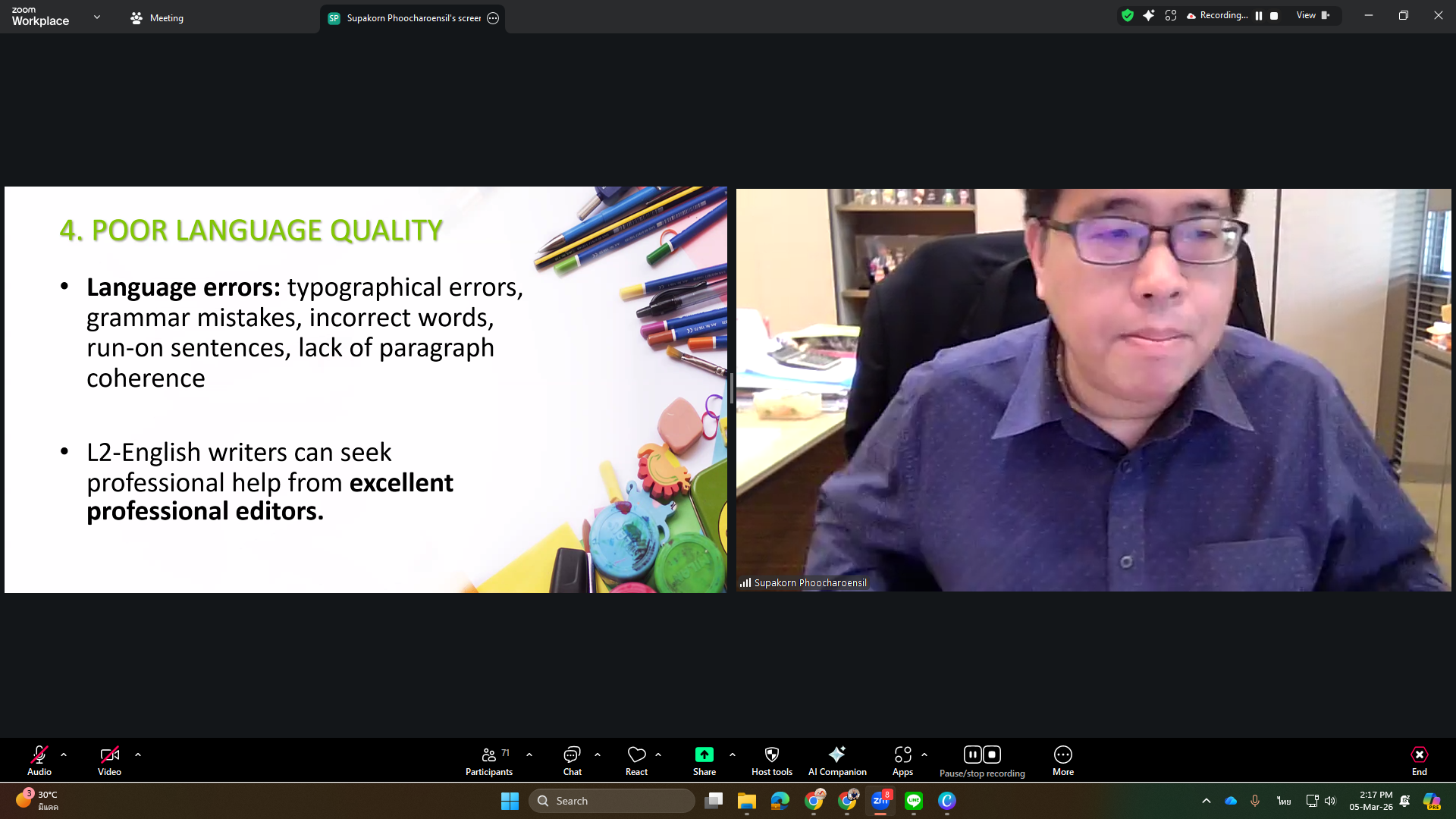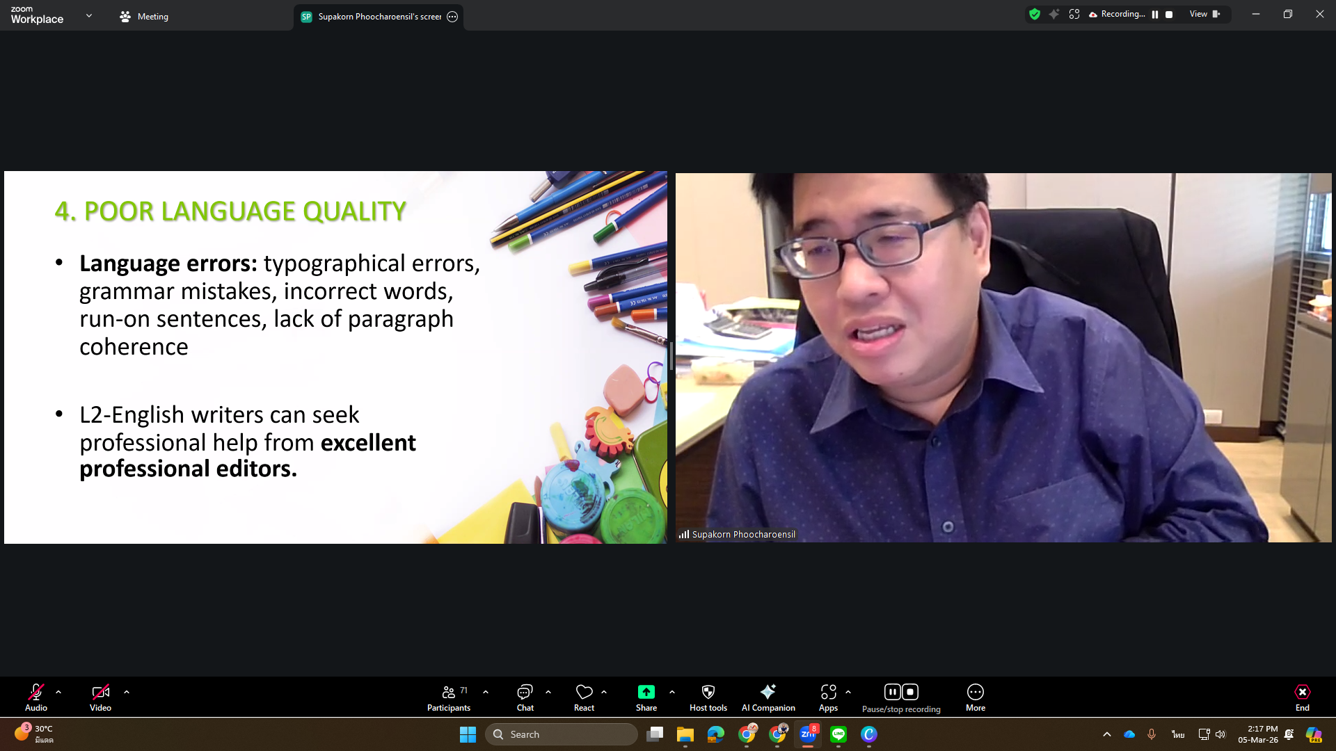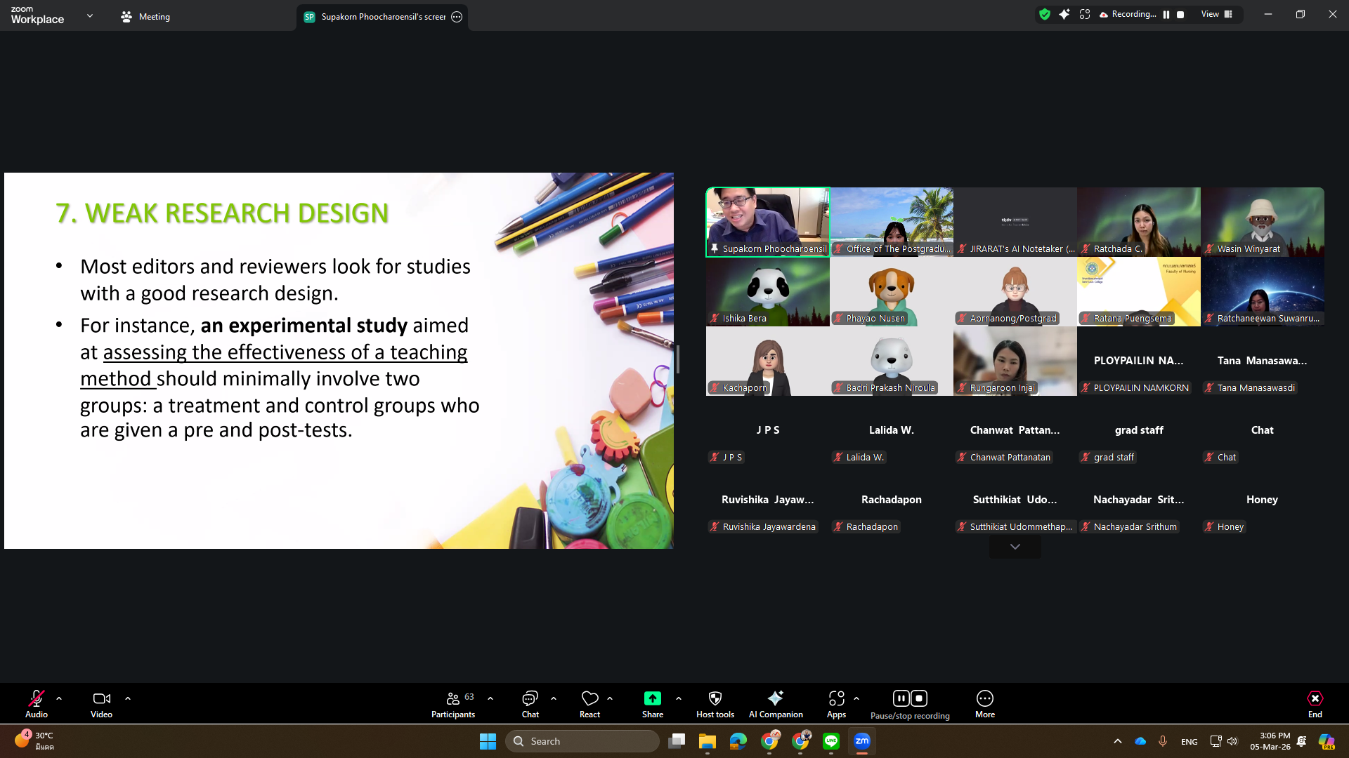 The Office of the Postgraduate Studies organized a training workshop titled “Write to Publish: Research and Academic Writing for International Journals” on Thursday, March 5, 2026, via Zoom Meeting. The session featured Assoc. Prof. Dr. Supakorn Phoocharoensil, Director of the Language Institute at Thammasat University, as the speaker.