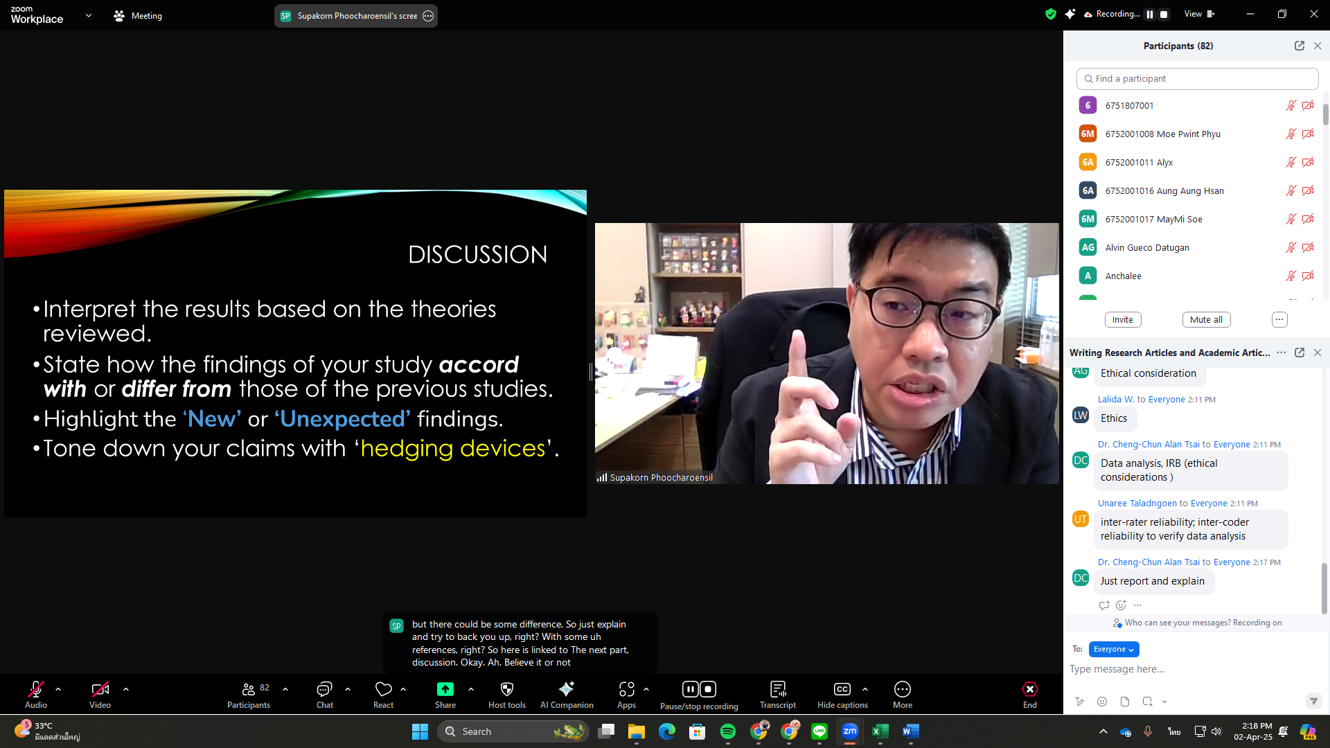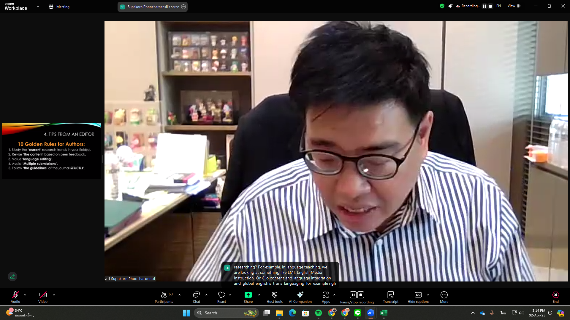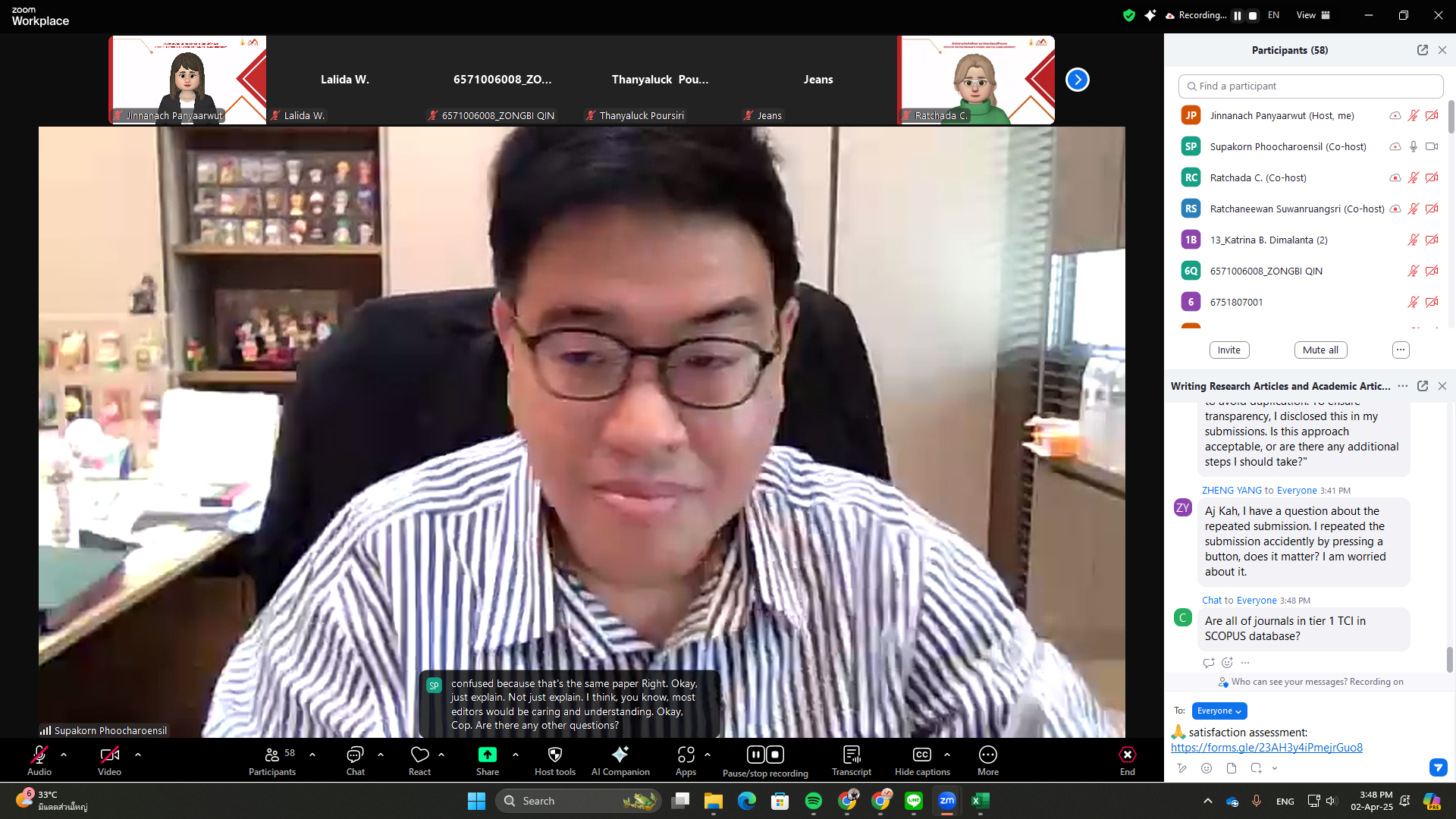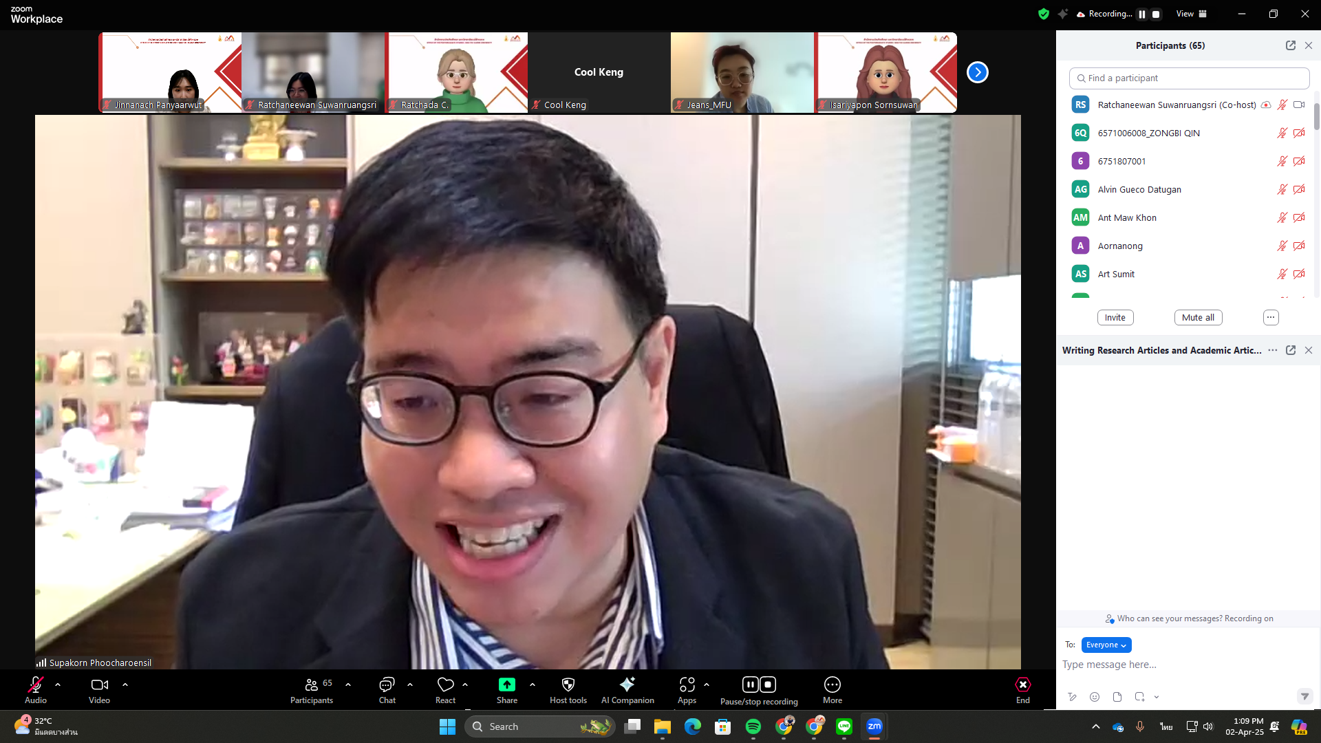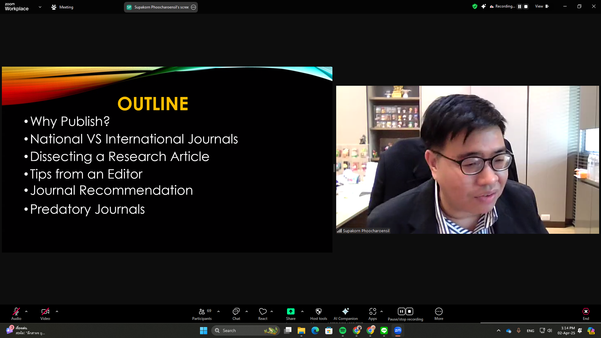 The Office of the Postgraduate Studies organized a training workshop titled “Writing Research and Academic Articles for International Journals” on Wednesday, April 2, 2025, via Zoom Meeting. The session featured Assoc. Prof. Dr. Supakorn Phoocharoensil, Director of the Language Institute at Thammasat University and Editor-in-Chief of the LEARN Journal (SCOPUS, ERIC, ACI, TCI-Tier 1), as the speaker.
